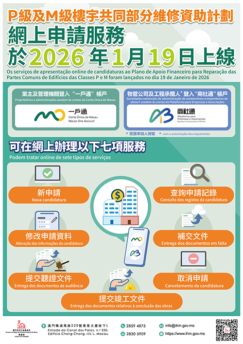 【本報訊】房屋局昨日推出P級及M級(低層樓宇)共同部分維修資助計劃的網上申請服務,業主、管理機關及物管公司可透過“一戶通”或“商社通”賬戶在網上提交申請及查詢進度等。