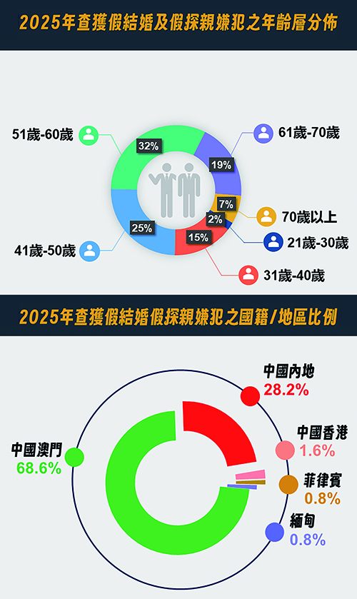 治安警察局微信公眾號發佈的2025年假結婚假探親個案總結顯示,去年該兩類個案共查獲嫌犯124人(男性及女性均佔62人),當中涉及中介人8人;查獲之嫌犯國籍/地區結構方面,澳門居民85人,香港居民2人,內地居民35人,菲律賓籍人士1人,緬甸籍人士1人。至於被查獲涉及假結婚及假探親人士年齡層分佈方面,以51至60歲較多,共40人;其次是41至50歲,共31人(假探親個案是指內地居民透過與澳門居民假結婚後,以探訪澳門居民配偶為由,向內地出入境部門申請赴澳探親簽注)。