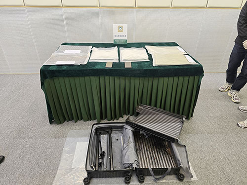 案情指,為加強打擊國際跨境販毒活動,司警根據情報結合風險排查,於日前得悉有販毒集團疑安排下線成員偷運毒品來澳,並鎖定一班於本月31日日間由國外飛抵澳門的航班上的可疑內地男乘客Kang。當嫌犯於當日飛抵本澳後,早已作出部署的司警在澳門海關及治安警配合下將其拘捕。警員將嫌犯的行李箱清空,發現行李箱重量異常,遂以工具割開箱內的兩側布料夾層,發現兩側各藏有一個膠袋,袋內裝著懷疑為毒品的乳白色顆粒,而膠袋表面沾有氣味刺鼻的辣椒油和咖啡粉,相信用作掩蓋毒品氣味,逃避警犬緝毒。
