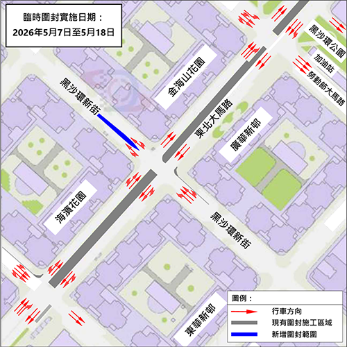 為此,公共建設局與交通事務局經協調後,預計由本今日起分三階段對海濱花園與金海山花園之間的一段黑沙環新街(近東北大馬路區域)進行局部圍封,並實施有限度通車,以保障東北大馬路與黑沙環新街交匯處至少保持雙線行車(具體安排見附圖)。