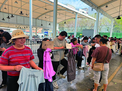 在康鷺新招工廣場內,眾多製衣廠負責人舉著樣衣、拿著寫有技能要求的紙條招攬工人;務工者則在各個招工攤位前穿梭,仔細比對工價、工時與福利。