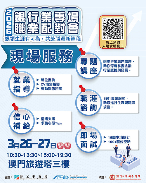 由即日起至3月24日,有意參加配對會的本澳居民可登入勞工局網站活動專頁(https://www.dsal.gov.mo/zh_tw/standard/bankingindustry_jobfair2026.html)報名,名額有限,預約從速。