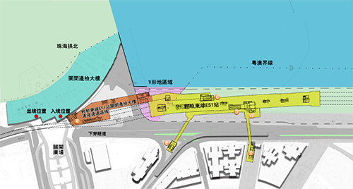新建的輕軌東線ES1站全天候連接通道位於關閘廣場現有的旅遊巴停泊區,通過直達地下空間及電扶梯,與關閘邊檢大樓出入境大堂相連,有助提升市民及旅客便利出行。