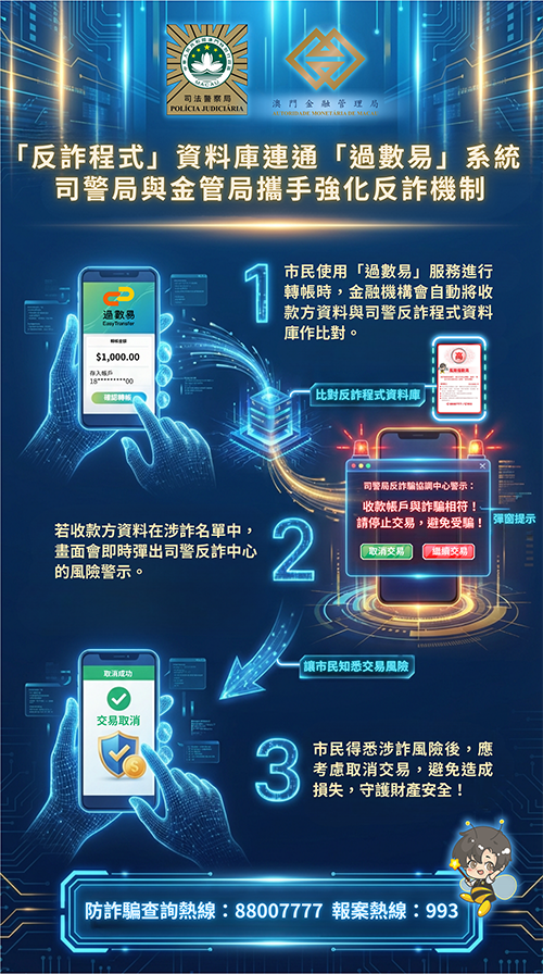 【本報訊】為進一步加強防範電訊網絡詐騙,司法警察局與澳門金融管理局透過“反詐騙聯動機制”合作優化“詐騙賬戶預警”措施,正式連通“反詐程式”資料庫和“過數易”快速支付系統,並協調金融機構在“過數易”加入識別可疑收款賬戶的功能,讓市民在進行“過數易”跨行轉賬操作時,可即時獲取倘有的風險提示,以及時識別潛在詐騙風險。