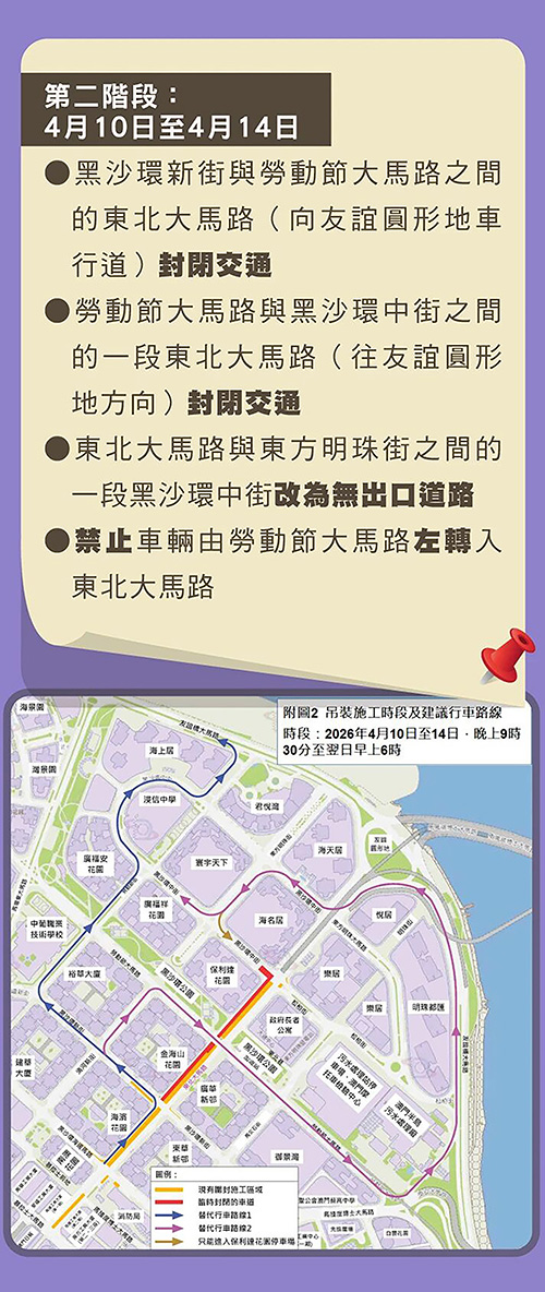 【本報訊】為配合東北大馬路空中走廊鋼結構吊裝施工,東北大馬路部分路段由3月30日起至5月18日期間每日晚上9時30分至翌日早上6時實施臨時交通管制,期間黑沙環新街至黑沙環中街之間的東北大馬路及其他相關路段封閉交通、有限度通車或改為無出口道路,公共巴士及其他車輛均需繞道行駛,部分巴士路線停靠站有變。
