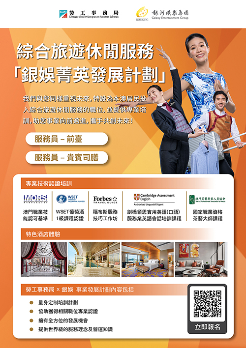 如欲了解計劃詳情,可瀏覽勞工局網站內相關專頁: https://www.dsal.gov.mo/zh_tw/standard/galaxy2026_pg3.html。有意參加者可由今日起至4月20日期間遞交網上申請。申請期結束後,銀娛將陸續通知符合條件的申請人出席4月22日舉行的講座及隨即安排面試,並向出席者詳細說明計劃的各項培訓內容及職業生涯發展路徑。