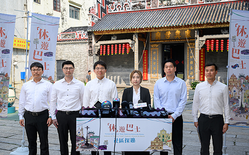 “‘休’遊巴士‧社區探趣計劃”新聞發佈會於昨日下午3時半在康公廟前地舉行,經濟及科技發展局、旅遊局、博彩監察協調局、交通事務局、治安警察局及市政署代表出席,介紹相關詳情。