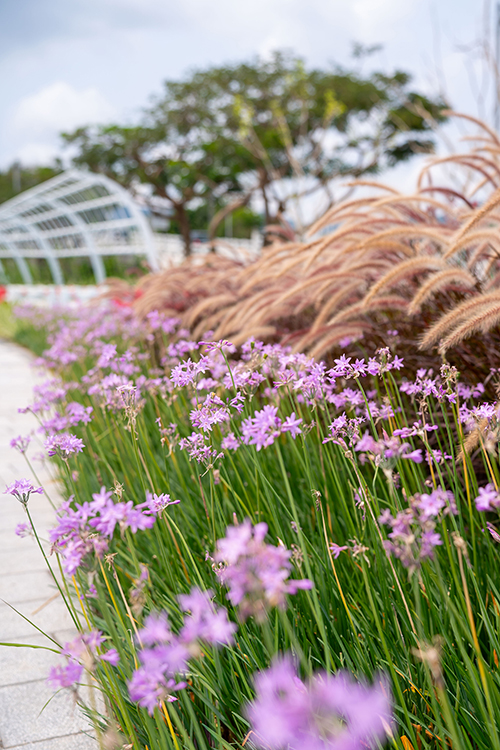 據市政署介紹,南岸海濱綠廊二期二區主要設有六百多米的沿海步道及單車徑,以綠化帶作分隔美化。單車徑兩側種植觀花樹種黃金雨,在盛開時可見枝條垂掛金色花串,猶如沉浸在金花瀑布之下;廊架種植蒜香藤,將會盛開粉紫色花朵,創設夢幻浪漫的氛圍;休憩空間則種植遮蔭效果較好的常綠樹種紅花玉蕊,為該區提供兼具觀花及遮蔭的效果。