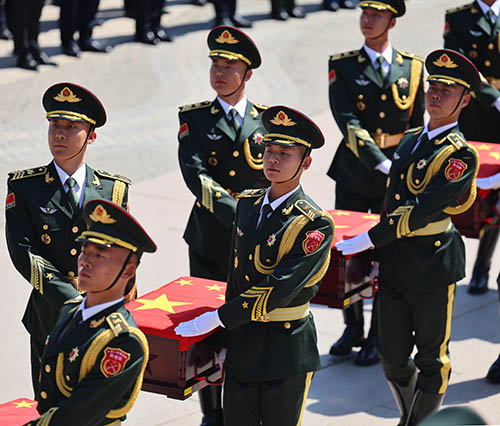 上午10時許,儀式正式開始,軍樂隊奏響悠揚的《思念曲》。禮兵在儀仗官兵持槍護衛下,護送志願軍烈士遺骸棺槨緩步進入紀念廣場,全場肅立,奏唱中華人民共和國國歌。致祭文後,現場全體人員向志願軍烈士遺骸垂首默哀,並三鞠躬。27名禮兵連續鳴槍12響,向英烈致以崇高敬意。